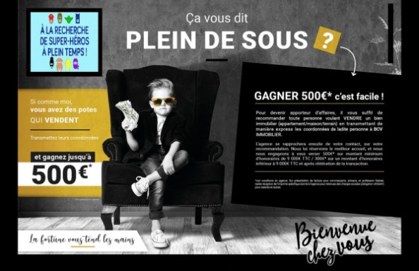 Vous connaissez quelqu'un qui vend un bien. Alors devenez partenaire de notre réseau et gagnez de l'argent facilement. Si la vente se réalise, vous touchez 500€ des honoraires, de quoi arrondir vos fins de mois.